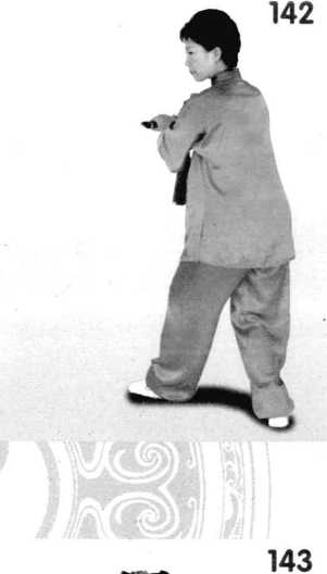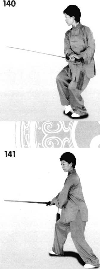 1 .胸向西北,右手持剑逆 缠,手心向下,弧形至右胸前 左手剑指附于右腕,重心在 左,右脚先收在左脚里侧。再 向右前方斜面上一步,右手逆 缠压剑至腹前右前方,眼视剑 尖。(图 140、141)