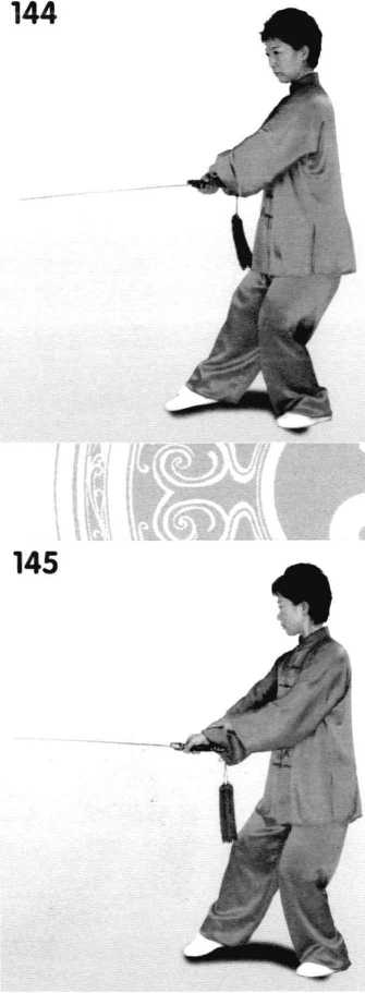 胸向西南,身体重心移 左,右脚向左脚的右前方横扫 一步,脚掌着地成右虚步,右 手持剑顺缠翻腕,平刃略走下 弧,带剑向身体左前方横向截 击,力达剑前刃,剑把在腹 前,手心向上,剑尖在左前方 正西偏南,剑指附于右腕,眼 视剑尖。(图144)
