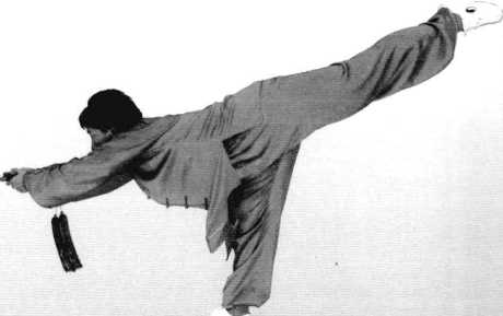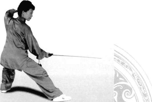 3 .右脚再快速向前上步重 心移右,成右独立步。同时, 两手捧剑向前刺出,左脚提起 向后平伸后蹬,剑与身体平 行,剑尖与左脚后蹬,前后形 成对称劲,上身略前探,眼视 剑尖。;(图179)