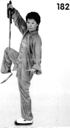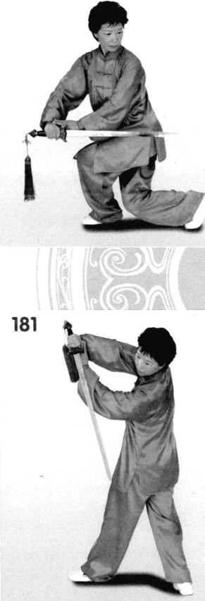 2 .左脚里扣,重心移左, 提右膝,上体随势右转至胸向 西北,右手持剑由身体左侧向 右上走弧形上提剑,剑指沉于 左胯外侧,剑尖斜向左侧下。 (图 181、182)