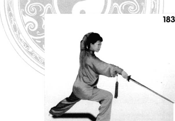 3 .右脚向右后落步,身体 重心移至右腿,快速向右后转 体,然后成右侧弓步,右手持 剑逆缠再顺缠,向身体右侧下 劈,手心向左,剑尖在右前方 (东南),剑指在左额上方,手 心斜向左上方,与剑尖相呼 应,眼视剑尖。(图183)