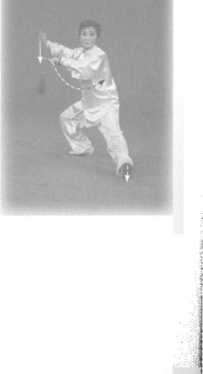 重心移至右腿,右腿微屈, 左脚提起,以左脚跟内侧紧贴地 面向左前滑出,同时右转,左手 背剑收至右胸前,右剑指侧撑。 目视前方。