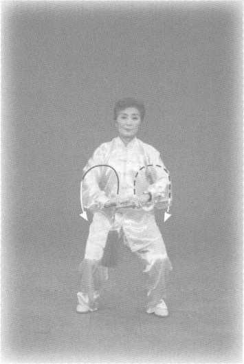 。屈脚平行开立,随两臂弧 形下落,两膝关节缓缓伸直。