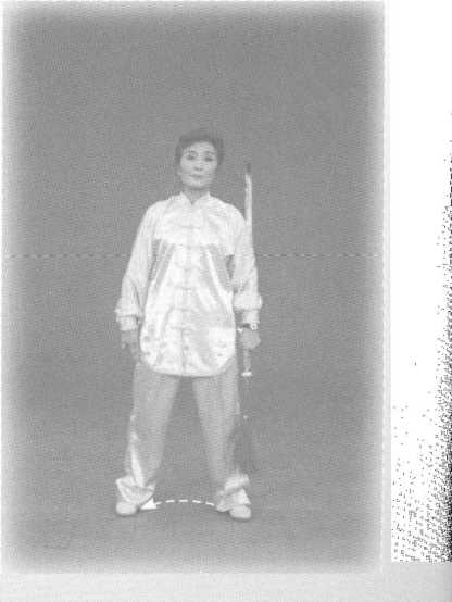 两臂微微前举向两侧划弧, 落至身体两侧,左手背剑,手心 向后,剑尖向上。目视前方。