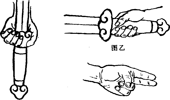 ,左手自然展舒,虎口对灌剑的护手处,拇指由护手上向 下,中指、无名指和小指由护手下向上,相对握住护手(由 于护手的形式不同,拇指也可以从下向上握),食指伸直贴 附于剑把上,剑身平贴于左前臂后侧。