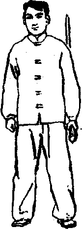 两足左右开立,距离同肩宽,脚尖略 外挪b身体自然直立,两臂自然下垂,左 手持剑,剑尖向上,剑身竖直八目视前方 (图 1)。