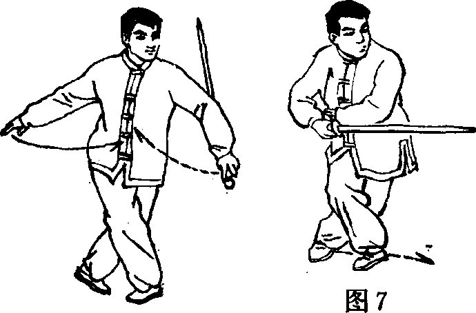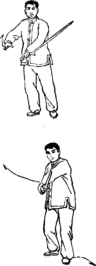 胸前向右划弧;左手持剑停于腹前,右剑指停于右侧,两手 心皆向下(图2).
