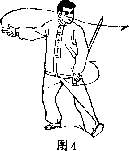 时,左手剑下落于左胯 前:右剑指翻腕手心向 上摆至右后侧,与肩同 高(图4)。