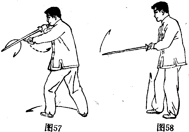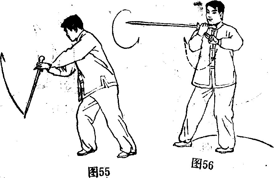 动作一+上体截向右转。右手持剑向右顺时针划弧平拦 然后翻腕敏宣上停于右侧,左剑指附于右腕部。在右手剑 划瓠的同时,30修至右腿,左腿向后退步(图55)。然后重 心后移筌承上体微向左转。右手持剑随体左转继续向左