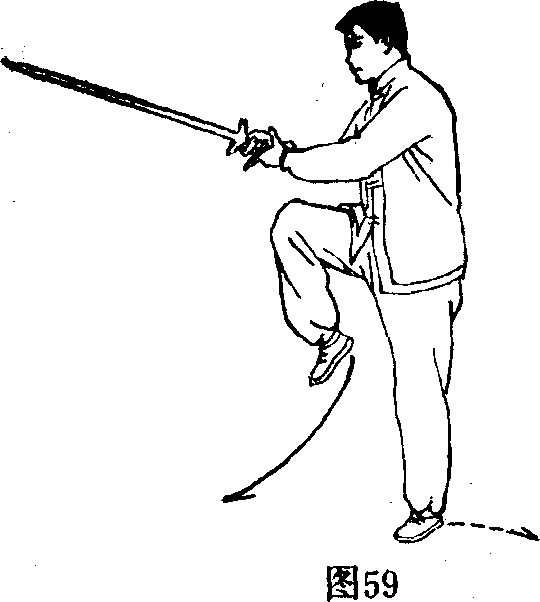 动作一:右脚擦地由后向左脚前移动;同时,右手持剑 翻腕手心向上与左手(剑指变掌)相合在腹前,左手捧托于右 手背下,荫/微屈(图58)。右膝向前提起成独立式;两手微 向上托起,剑在胸前,剑身直向前方,剑尖略高5目视前方 (图 59)。