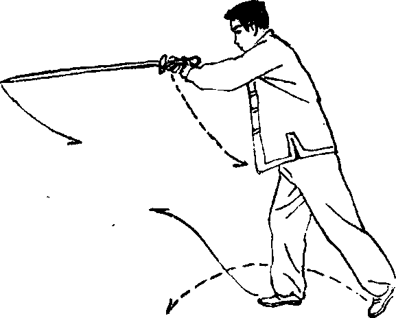 力蹬地,左脚随即前进 一步踏实,右脚在左脚 聘落未落地时,迅速向 左腿内侧收拢(脚不落 地)§同时,两手捧剑 先微向回收,紧接随右 脚落地再直向前伸刺, 然后随左脚落地两分开 手撤回身体两侧,两手 手心都向下,左手再变