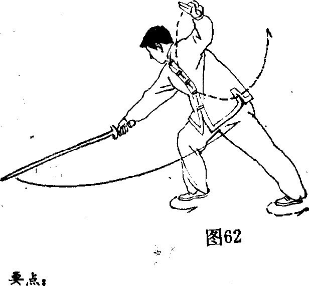 动作三:右脚向前落步屈膝成右弓步3同时,右手持剑 向前立剑直鹤,力注剑尖J左剑指向后绕至左额上方,手心 斜向上3上体略向前倾,目视剑尖(图62)。