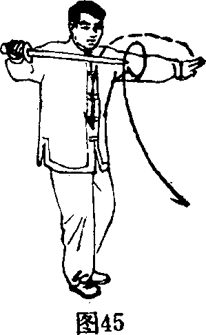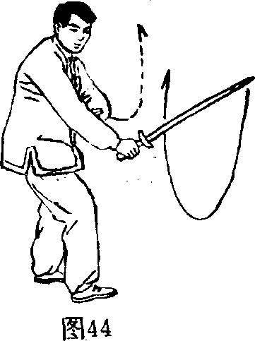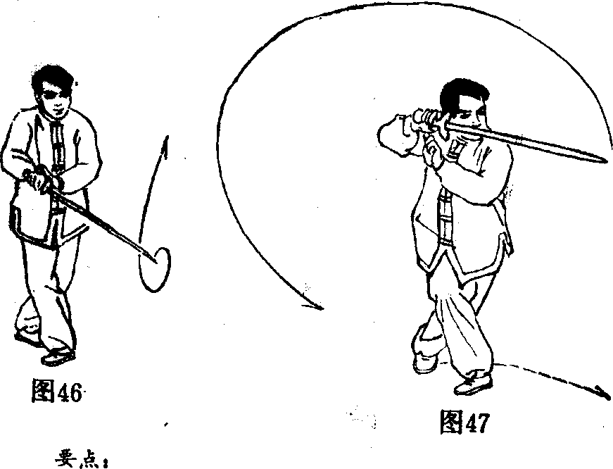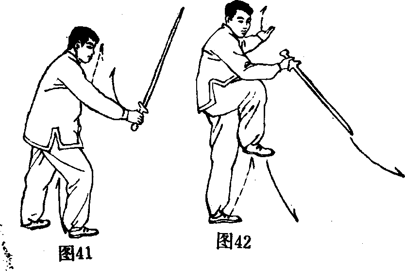 L图40-42是一个完整的、不间歇的划弧动作。所以, 右手持剑必须在划弧过程中翻腕旋臂使动作更加圆活连贯、 连绵不断。