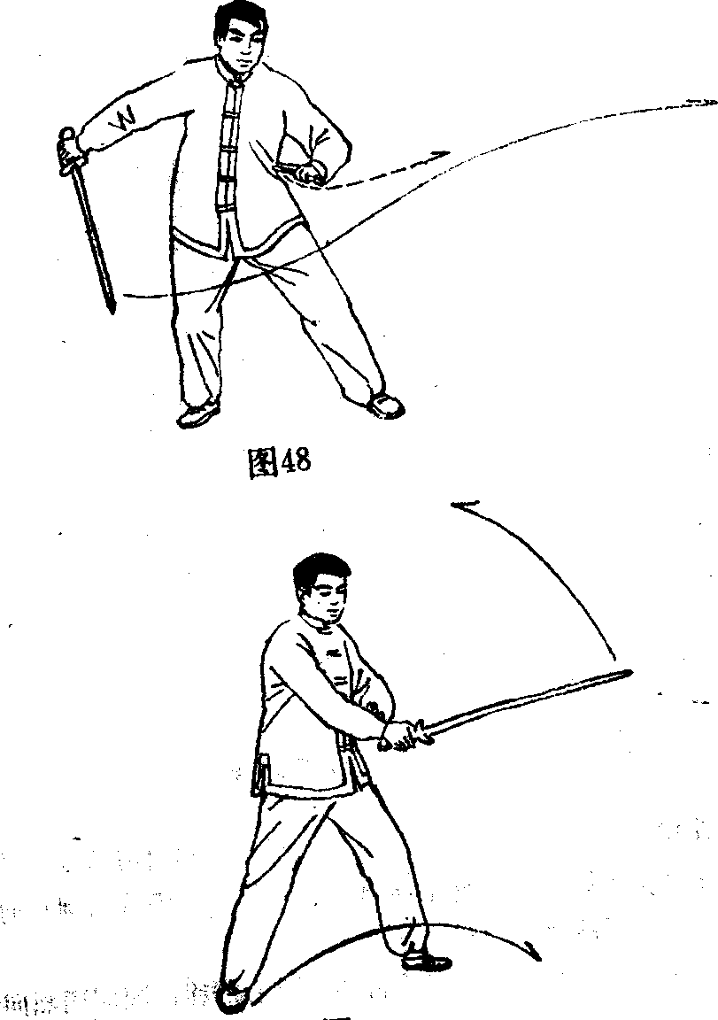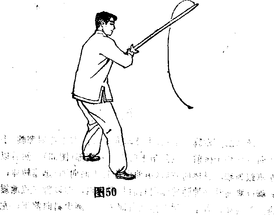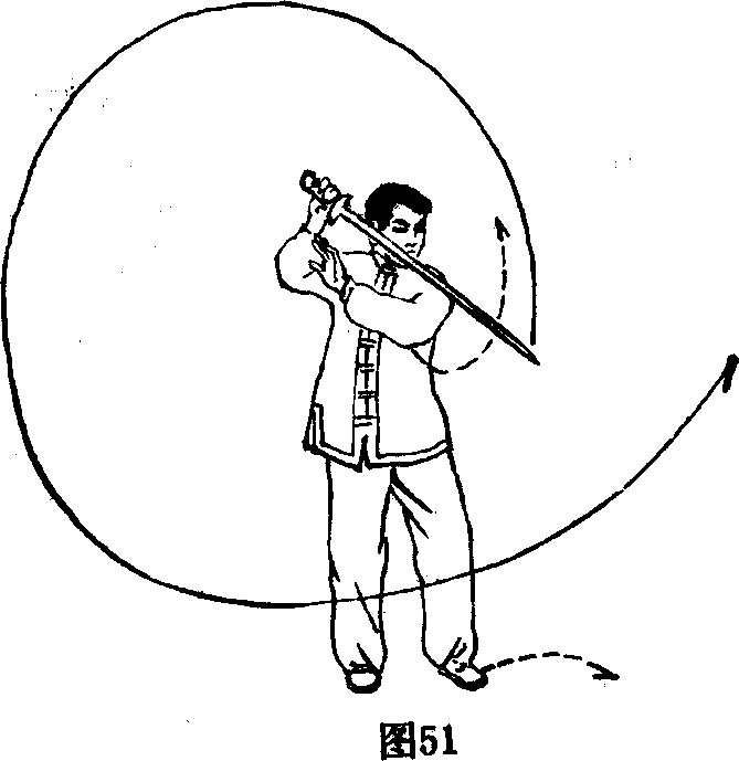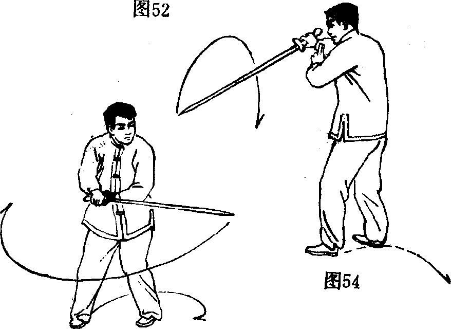 1 ?此式主要剑法为撩剑。图50—图52为左右各立圆撩剑