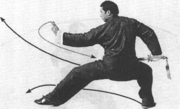 (2)身体继续右转,右腿弓住塌劲,提起左脚向前上步,