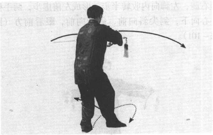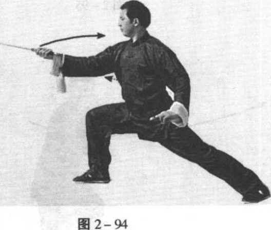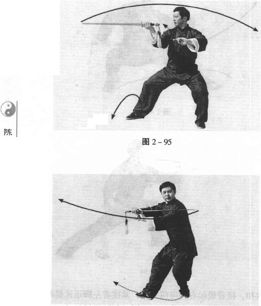 (1)身体先左转再右转,左腿弓膝塌劲,身体重心移至左 腿,提起右脚向前上步,脚尖外摆,右手逆缠向左划弧,随摆 脚转至胸前,手心向下,臂成弧形,剑横于胸前,剑尖向左, 左手向内按至右腕上随右手转动,眼看前方(图2-95、2-