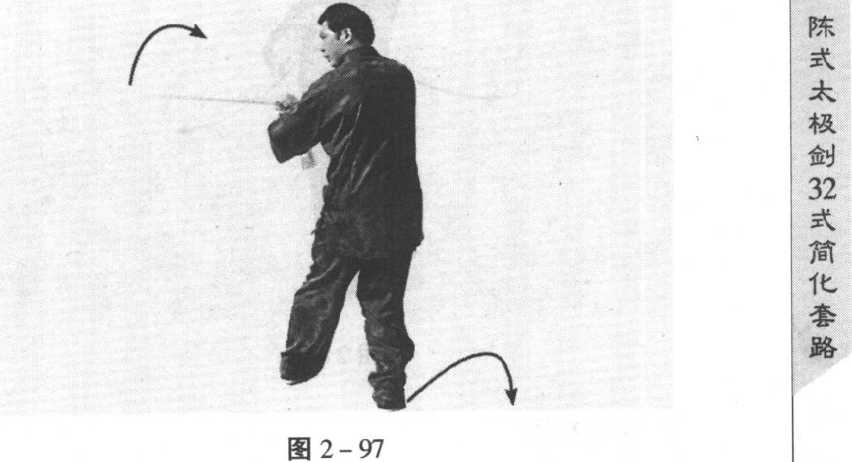 脚尖内扣,接着提起右脚向前上步,紧接着左脚迅速提起,向 前跃步,右腿微屈,成右独立势;同时剑随身体转动,两手手 型不变,眼法不变(图2-97、2 - 98 . 2 - 99)。
