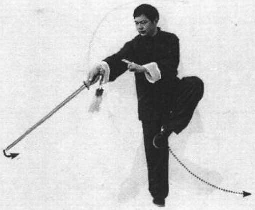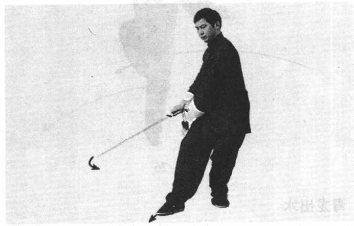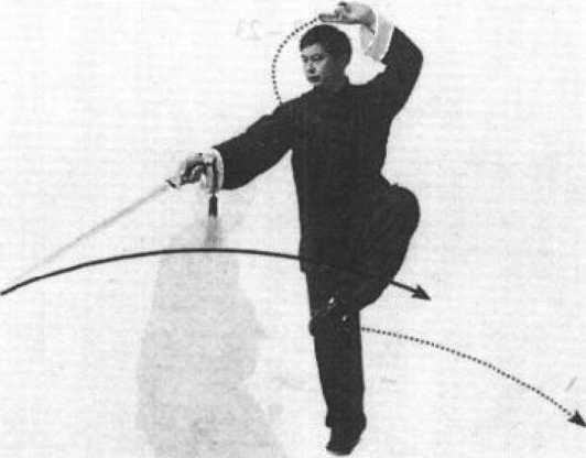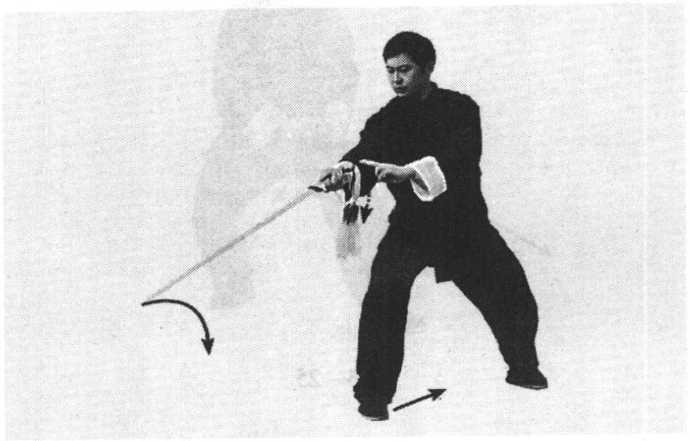 (1)身体继续右转,但右独立势不变。右手顺缠剑向右下 方劈转,力达剑刃前段,剑尖斜向右前下方,手心斜向前,左 手逆缠向内转至右肘内侧,手心斜向右,剑指斜向上,眼看右 前方(图3-22)。