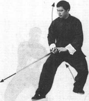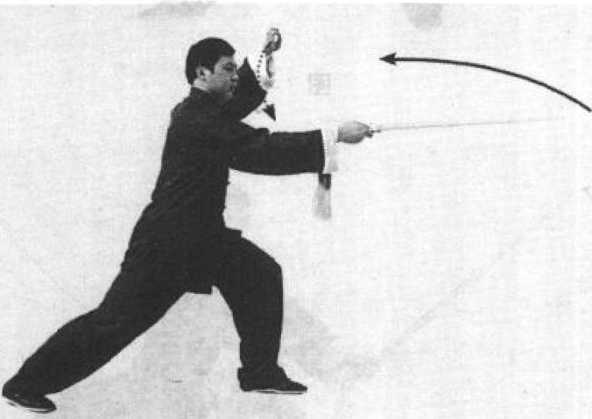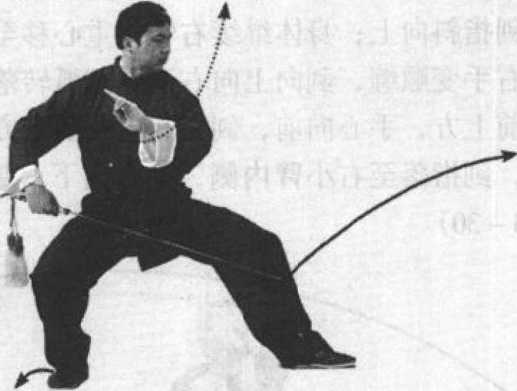 120屈膝下蹲成半马步,同时右手屈腕,剑向内转至体前,左手顺 缠,屈肘向下转至右侧胸前,手心向右,剑指斜向上,眼看左 前方(图3-27)。