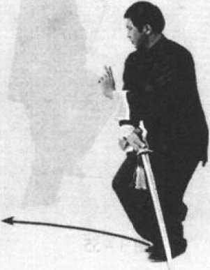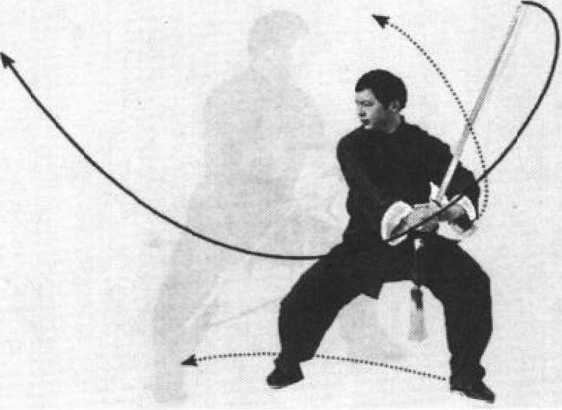 (2)身体右转,左腿弓住塌劲,提起右脚向右前方上步, 随之向前弓膝塌劲,重心前移成右骗马步,剑向右前上方转 出,剑尖略高于头,剑尖斜向右前上方,手心斜向上,同时左 手逆缠向下向左划弧转左胯前,手心向下,剑指斜向前,眼看 右前