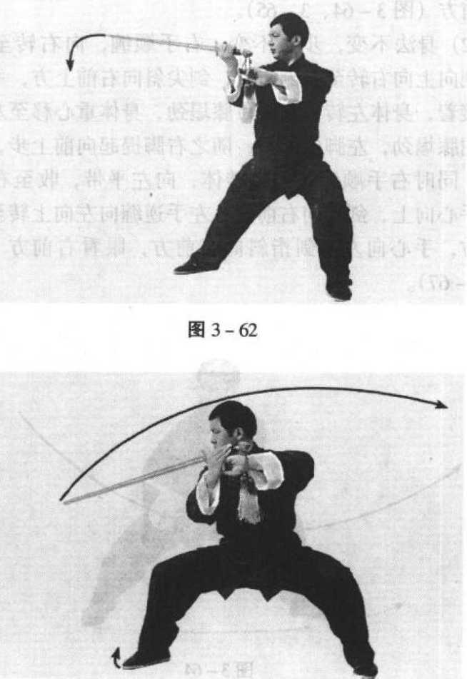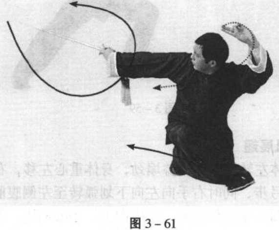 陈 式 太 极 剑陈 式 太 极 剑图 3-60图 3-60侧向右后侧插步,脚前掌着地,接着,两腿屈膝下蹲,形成歇 步;同时右手逆缠,剑尖向下向右再向上反撩,剑尖高于头, 手心向后,左手逆缠向左向上转至额前上方,手心向上,剑指 向右,臂成弧形,眼法不变(图3-61)。