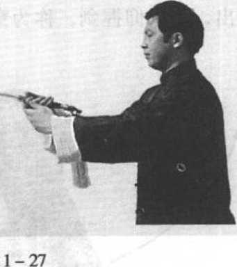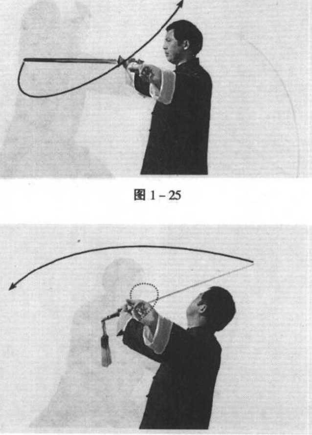 正握剑,剑从头前上方经过头上方时,头要随之向后仰, 眼看剑,从面前经过。向左或向右平绕一周,以腕为轴,称为 云剑(图 1-25、1-26、1-27)。