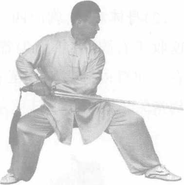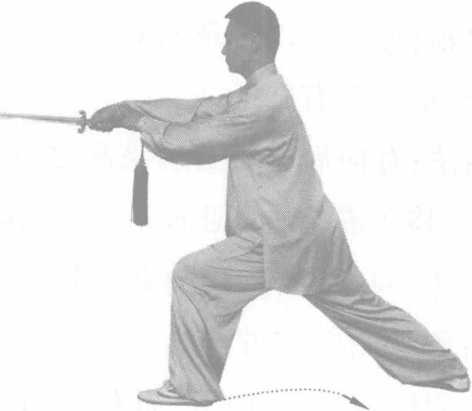 动作要领:左剑指与右手剑要合劲,松沉到脚底。