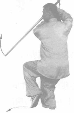 技击用法:耳听身后有人,迅速转身劈击对方。