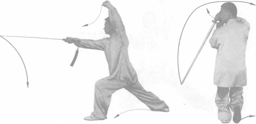 动作要领:转身劈剑要以身带剑,劈剑与左脚活步成弓 步要协调一致。