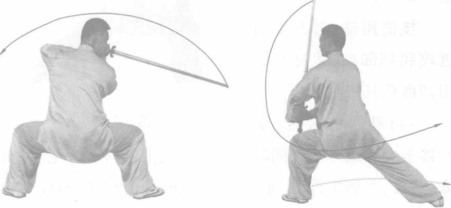 动作要领:重心左右移动与腰部左右转动形成回转的 身法,并带动剑向右下扫,剑法要与身法协调一致。
