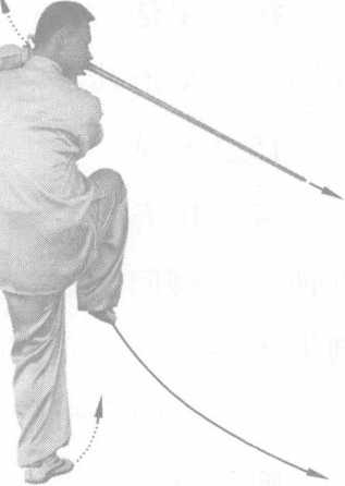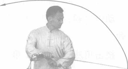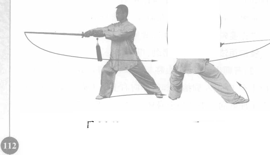 技击用法:对方躲过我横扫,进而向我右腿进攻时,我 用剑向外格挡,并迅速提起右足以避其锋。
