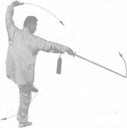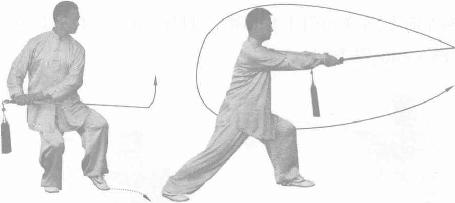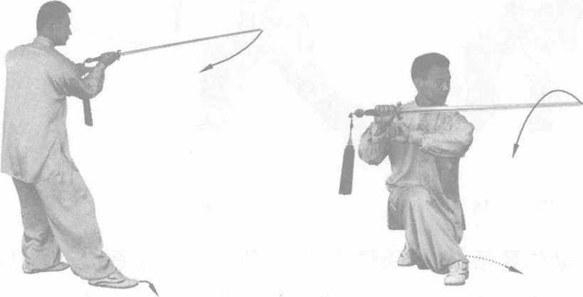 动作要领:剑要随腰转动,蓄劲落于右胯旁,松到脚底。