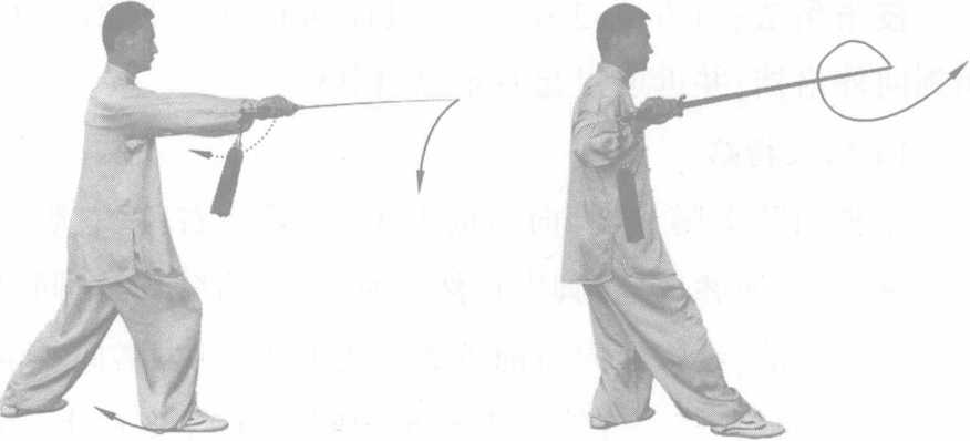 技击用法:对方后撤,我粘住其器械随势,蓄劲。