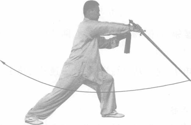 动作要领:撤步与撩剑要协调一致,同时完成。撩剑要 贴近身体。