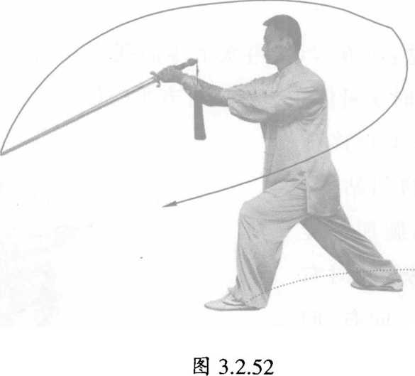 (1)身体先左转再右转,重心先左移再右移;同时右手 握剑随转体向上、向后、向下、向左前撩出,左剑指贴在右手 腕上,随右手一起摆动。目视剑前方,耳听身后。(图3.2,50)