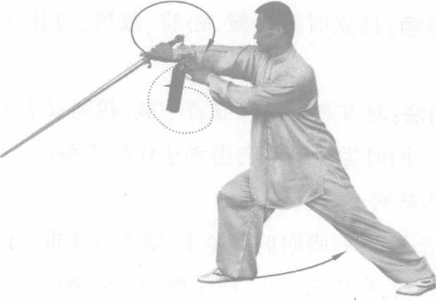 技击用法:对方进攻,我粘住对方器械略后撤,接着向 前撩击对方手腕。