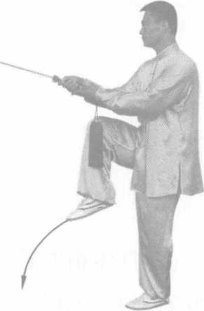 动作要领:撩剑要以腰带动,贴近身体立圆摆动。