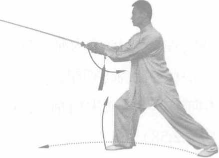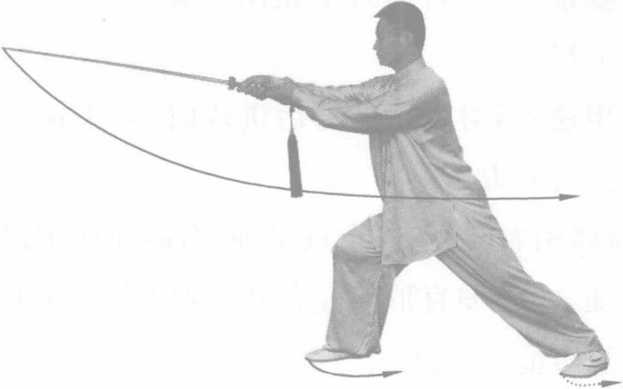 动作要领:向左转体时要先摆左脚,再扣右脚,以身带 剑随转体平扫。