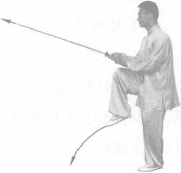 (1)身法不变,右脚向前上半步,随之身体重心向前移至 右脚,屈膝塌劲,形成右弓步,两手握剑向前微送;紧接着,右 脚迅速用力蹬地跃起,提起左脚向前跃步落地,形成左独立