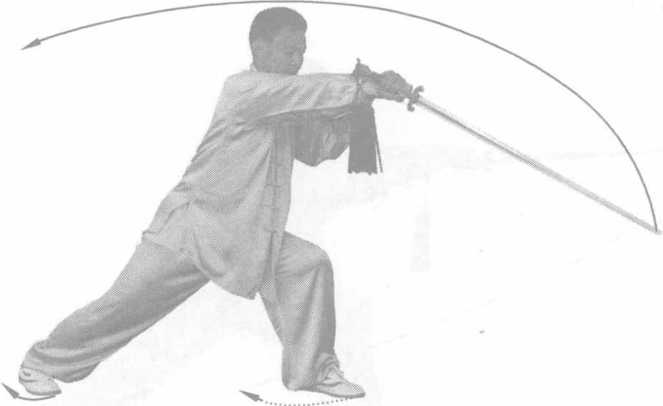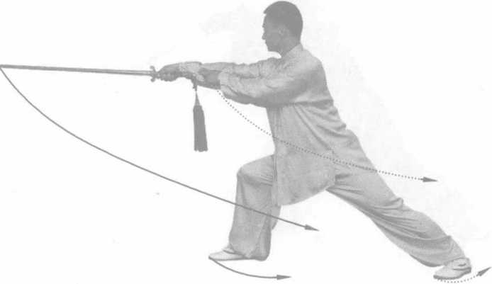 动作要领:此式为发力动作。左腿成弓步与右手反刺剑 要协调一致,同时完成,左剑指与右手要形成合力。探刺定 势时上体微左前倾。