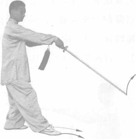 技击用法:侧身闪开对方攻击,上步点击其手腕,使其 器械落地。