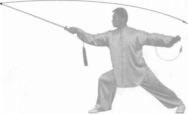 图 3274图 3274(1)身体左转,胸向十 点半钟,重心移至左腿,屈 膝塌劲,形成左偏马步;同 时右手屈肘内旋,剑尖向 上、向左划弧转落至左侧前 方,手至腹前,手心向内,剑 尖斜向前上方,左手内旋向 下转落至腹前,剑指附于右 手腕上,目视左前方。(图 3.2.74)