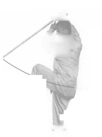 图 3.2.78图 3.2.78(4)身体右转,胸向四 点半钟,两腿站起,身体重 心移至左腿,右腿屈膝提 起,脚尖自然下垂,形成左 独立势;同时右手屈肘外