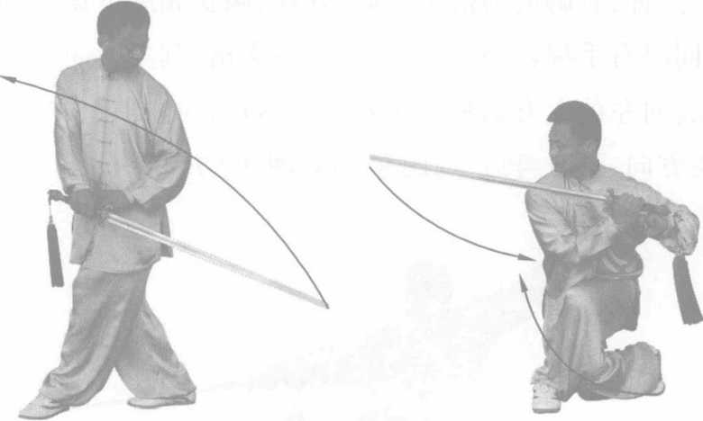 技击用法:身体右侧下部受到攻击时,我即右转用剑尖 由前经体侧向后挂开对方器械,刺击对方下身。