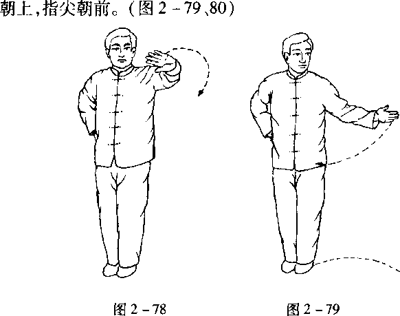 预备 身体直立,右手叉腰,拇指在后,左手向左侧伸出与肩同高,掌心朝外,手指尖朝右上 方。(图 2-78)