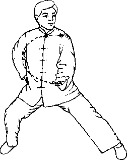 口令1重心右移,左腿向左横开一大步;同时,左手内旋由上向下向内划弧于左腹前,掌心