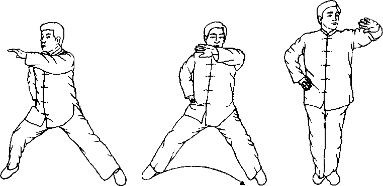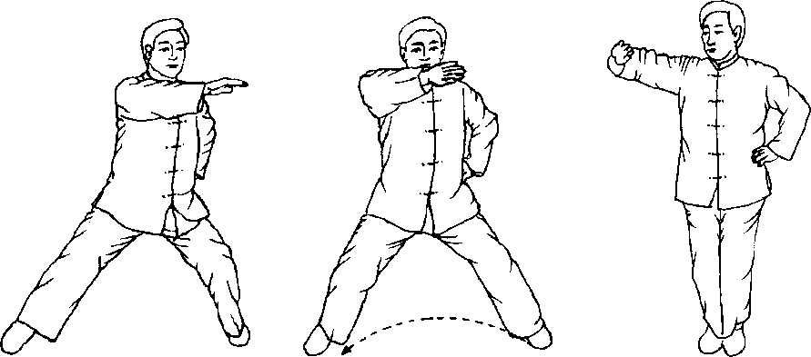 口令2重心左移,随之收右脚与左脚并立。同时左手外旋由左腹前先向右上方,再向左划