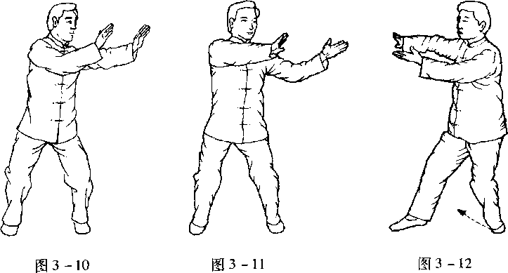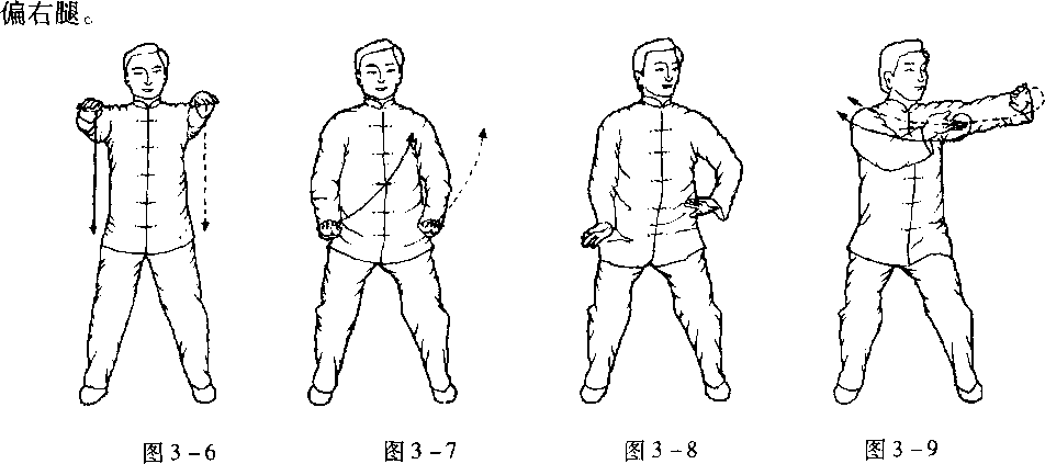 左脚跟抬起。口令 4(图 3-5)左脚踏实,重心在两腿之间左脚跟抬起。口令 4(图 3-5)左脚踏实,重心在两腿之间身体缓缓下沉。