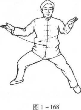 口令1(图1 -168、169) 身体左转,重心右移,同时双手内旋相合于胸前,左上右下,掌心