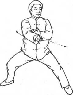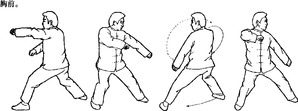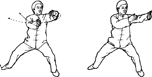 要点:此势的发劲是一种短距离的击打,发劲时,注意重心下降,气沉丹田,蓄而后发,以身带手,左臂与右肘动作一致,形 成对称。